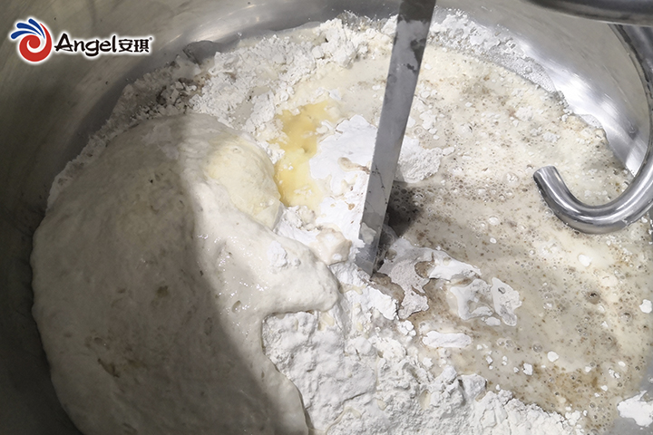4.面团搅拌至7成面筋,加入黄油和盐,继续搅拌至面筋完全形成。