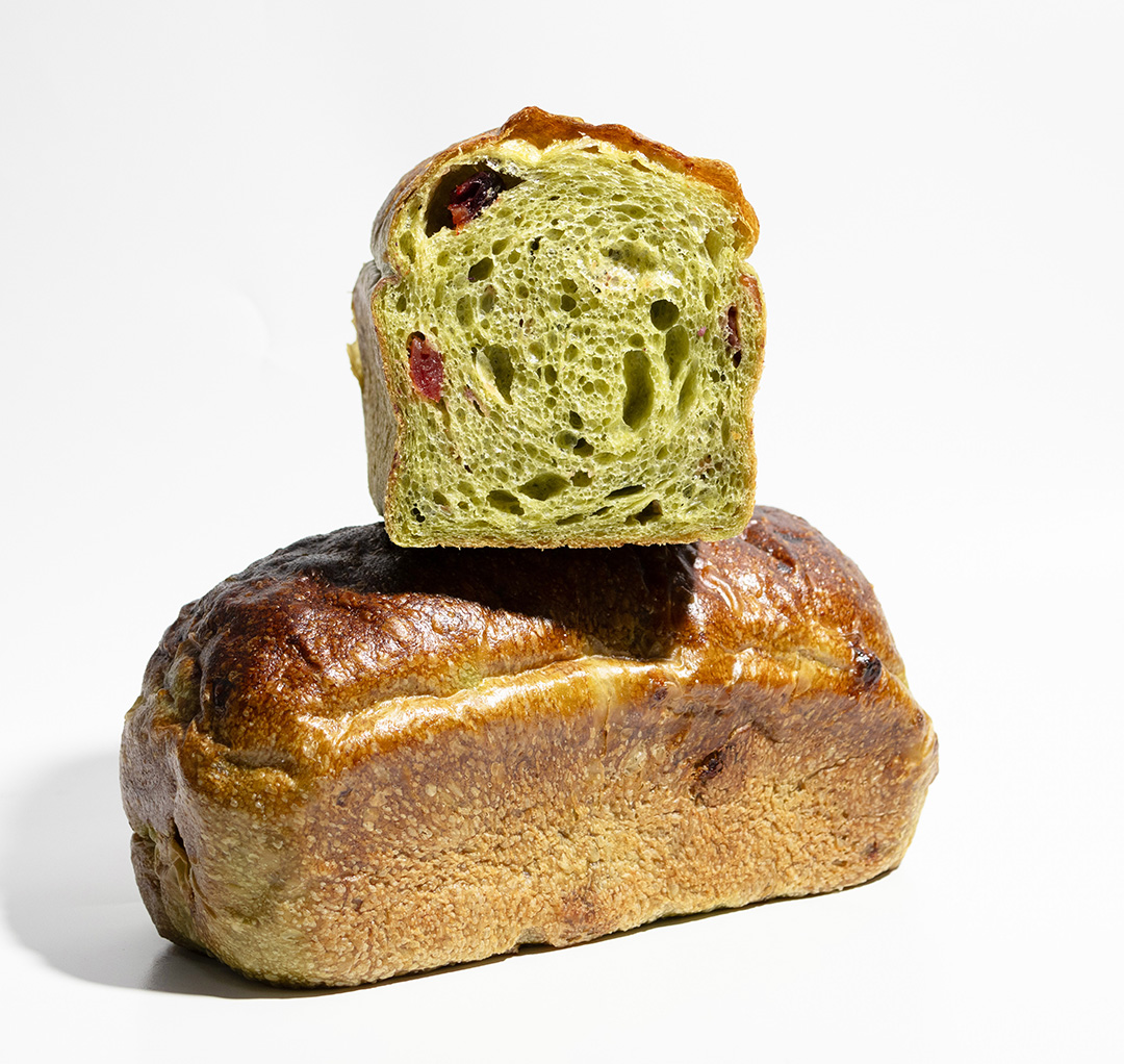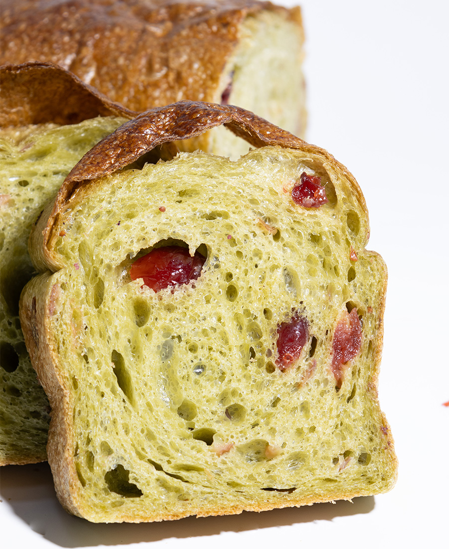 1.和面。将面包粉、水混合均匀,水解30分钟。加入盐、鲁邦种、鲜酵母打至8成,全程慢速。缓慢加入第二份水,打至9.5成筋。再加入汤种、橄榄油、抹茶粉搅拌均匀,再将蔓越莓加入搅拌均匀。