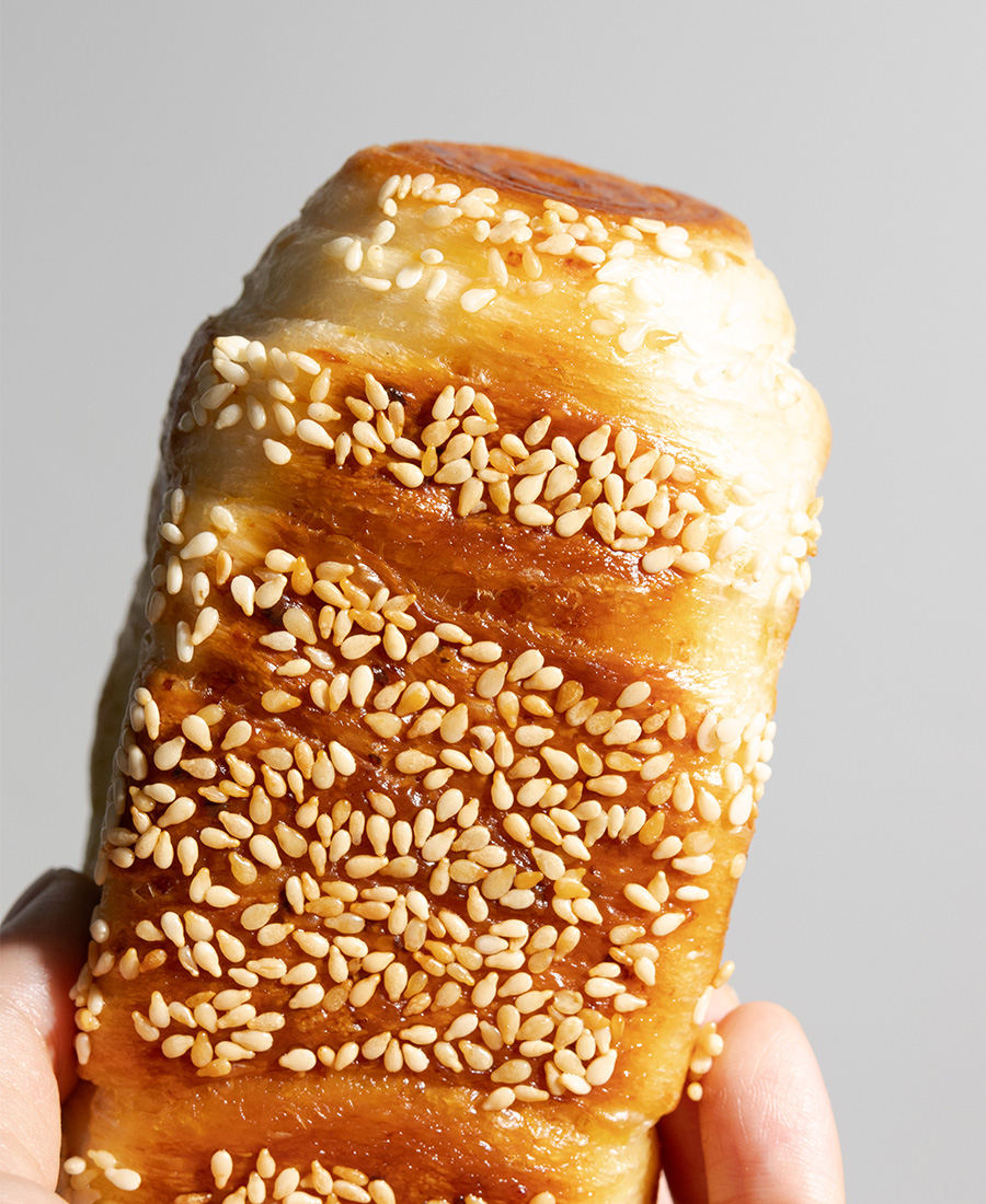5.成型。面团擀开,包10g内馅,卷紧成盐可颂型,底部粘白芝麻,放入小吐司模具。